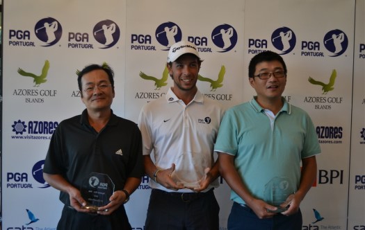 FOTOS: Ricardo Santos, um dos quatro líderes da primeira volta e António Rosado com os amadores Ping Wu e Ping Xu, vencedores do Pro-Am.