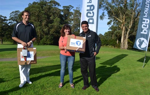 FOTOS: Hugo Santos com o troféu e cerimónia da entrega de computador à Aurora Social, com o profissional Rui Índio e o presidente da PGA de Portugal José Correia, e a presidente da IPSS Cristina Amaral.